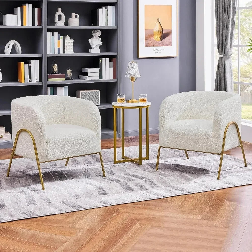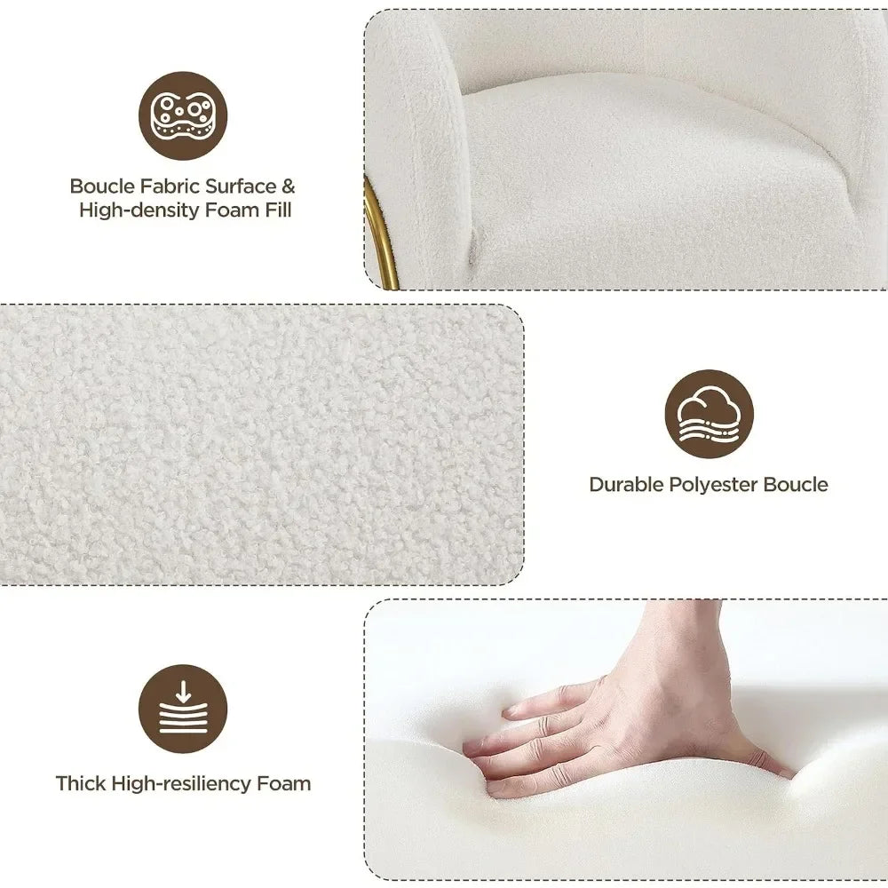 - 【Decorate Your Room with Ease】This pair of cute accent chairs features a barrel-shaped seat, downward V-shaped legs with a gold finish and textural boucle fabric for a Scandinavian minimalist vibe. Measuring just 27" W x 27" D x 28.5" H, this compact accent chair fits easily in narrow nooks and small spaces.